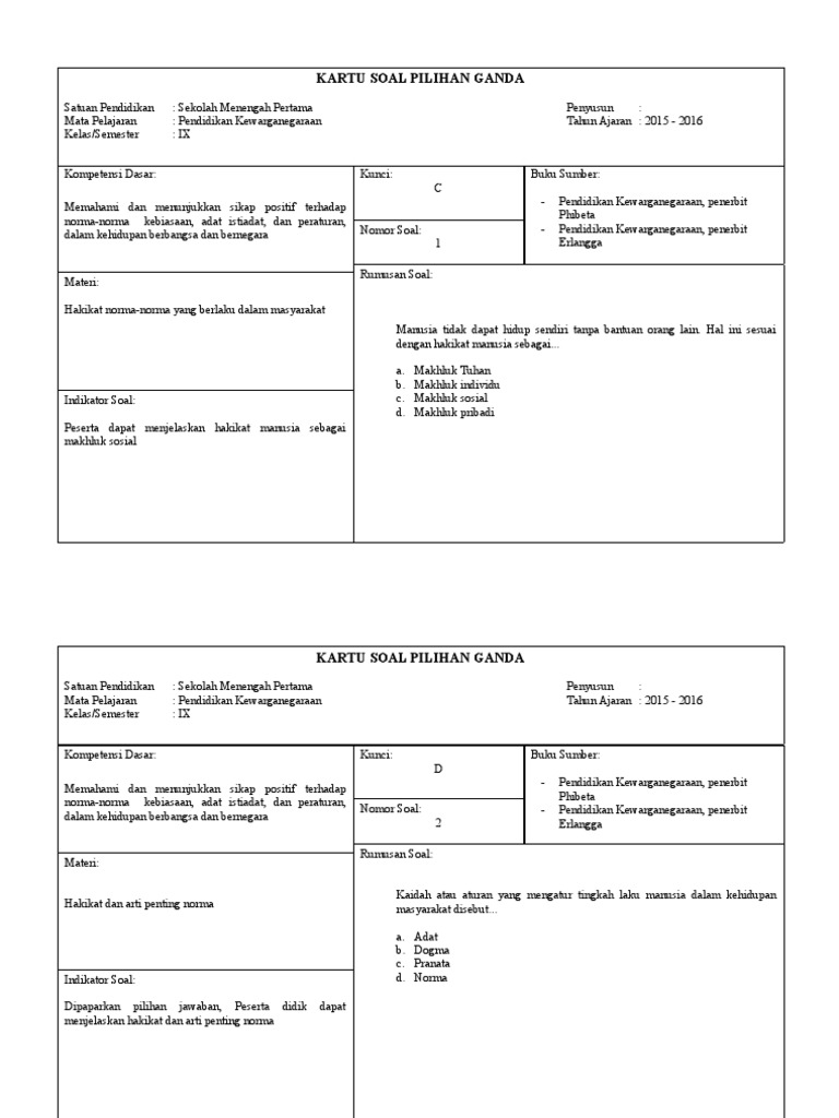 Download buku ips kelas 7 8 9 ktsp kurikulum 2006 semester 1 2 ini merupakan sumber belajar yang mungkin anda butuhkan dalam menunjang pembelajaran baik smp maupun mts. Berikut adalah Soal UTS PKN SMP Kelas 8 Semester 1 Ganjil yang bisa sobat download atau copy adalah sebagai berikut. Kartu Soal Pkn Smp Docx Contoh soal uas pkn smp kelas 7 8 9 ini kami bagikan secara gratis untuk di download soal uas pkn smp dan kunci jawaban soal ujian sekolah pkn smp dan jawabannya bank soal pkn smp.