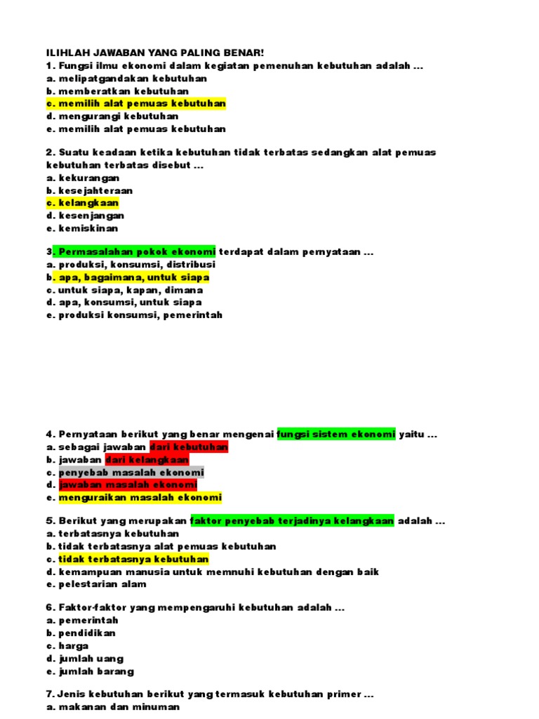 50 Soal Jawaban Bab Kelangkaan Dan Kebutuhan Manusia Pilgan Essay
