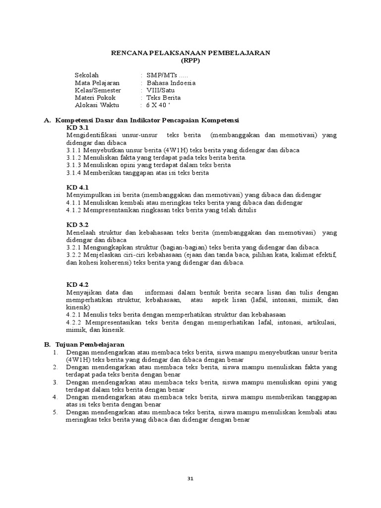 Rpp Revisi 2017 Bahasa Indonesia Kelas 8 Smp