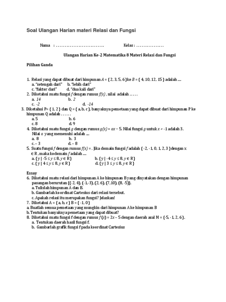 Kumpulan soal relasi dan fungsi smp kelas 8 pdf. Bagikan atau tanam dokumen. Contoh soal latihan matematika relasi dan fungsi kelas 8 semester 1 i.